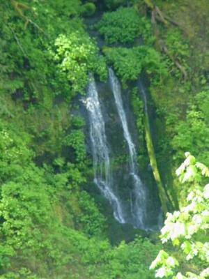 LeRoy is watching his mother negotiate the slick stones. Behind him you can see the green everywhere, and the mini-falls dropping just in front of the fallen tree, with the valley extending into the distance. The surface of all the stones are very wet from the recent rain shower, and we had to watch our step to avoid slipping.