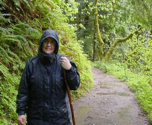 We continued up the path for a ways, as the rain started coming down in earnest. You can see Dotti has her hood on, and the background is dark, and her coat is wet. (Fortunately Dotti and I had water proof jackets on.) The temperature had dropped, and my hands were nearly numb when I snapped this picture.