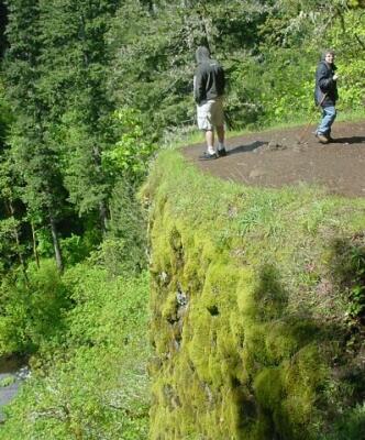 The first of 3 pictures we took at this location. Here you see LeRoy and Dotti standing out on a ledge with a very long drop below them, enjoying the breathtaking view. Eagle Creek is far below, but not visible in this picture. Notice how every rock surface is covered with green growth of one type or another.