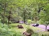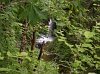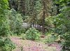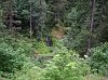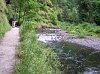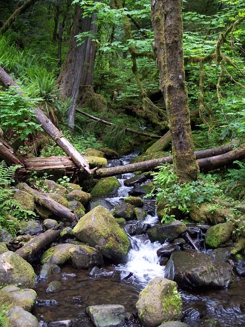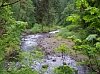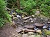 This picture, looking up the stream from the crossing, is filled with many interesting things. The water of course is dancing down the stones happily, turning white in the rapidly changing streambed terrain, and then back to clear as crystal moments later. The moss is covering the rocks and climbing the tree trunks. Fallen trees crisscross the scene, and water worn rocks appear in various sizes. Lush greenery closes in as the stream fades into the shadows. |