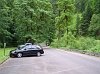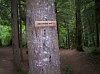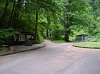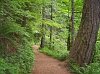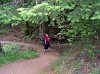 Looking from the van towards the trailhead. You can just see Dotti, who was getting off to an early start. She is up by the trailhead marker. The trail at this point gives little hint of what wonders that lie ahead along its more than 13 miles of length. However, it does flaunt its incredibly green cover even at the beginning. |