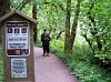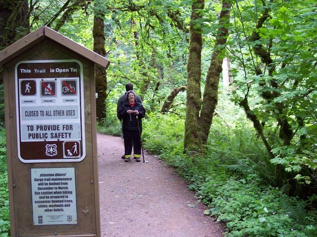 While Dotti waits behind the trailhead sign, LeRoy is catching up. Note the wide smooth surface of the trail at the start. They have put a great deal of work into maintaining this trail, and I don't mind at all the $3 parking fee to help support that effort. Later on there are places where the trail is not as wide and smooth as it is at the start, but I think they do a marvelous job at keeping the path clear and ready for hiking! |