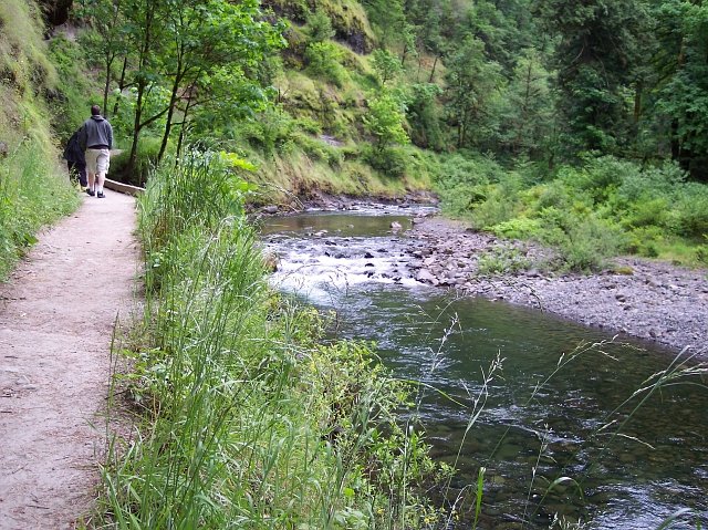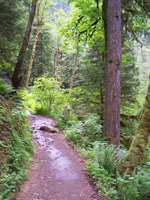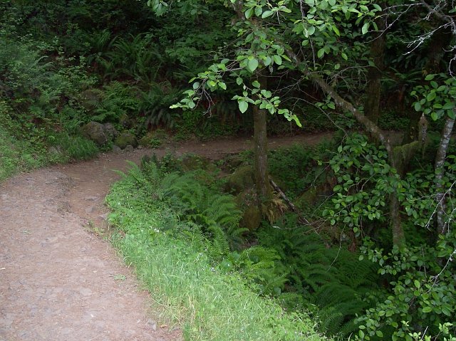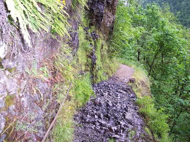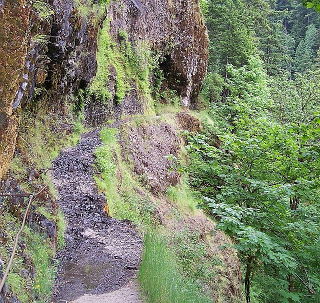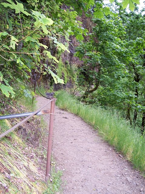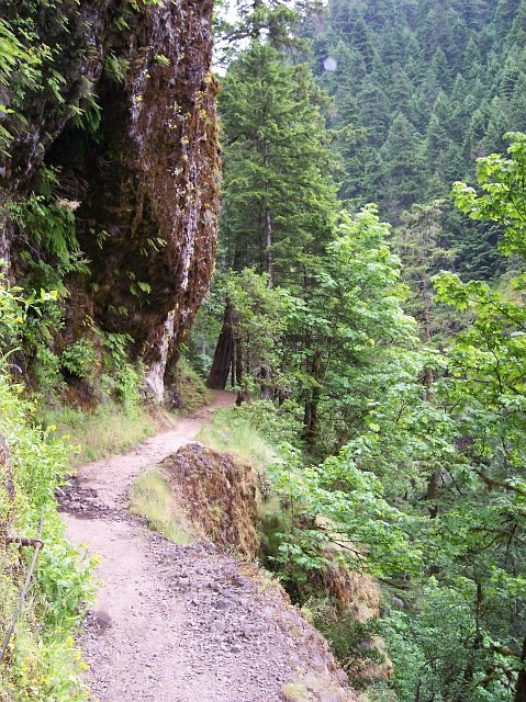 So, what do we look at? The beautiful Eagle Creek valley ahead and to the right, or the sharp rock wall leaping upwards to the left? Or perhaps the little narrow path straight ahead? Notice how rough the path surface is. The boots that I now have for hiking, I acquired because of this very trail, but for the stretch of it up near Tunnel Falls. The rocky surface of the path at that location pushed up into the bottoms of my feet when I wore tennis shoes, and it was quite painful. With my boots on there is no problem with stony paths. |