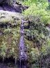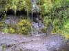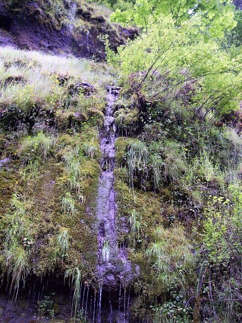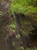 This miniature waterfall is fed by a stream that is hiding beneath the plants that extend down the hill right up to, and even over, the top of the falls. |