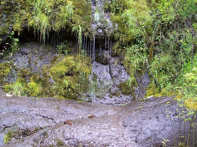 A baby waterfall dropping almost covertly down the rock wall beside us. At the bottom, after running for a while as a thin sheet, it breaks up into tiny discreet streams. |