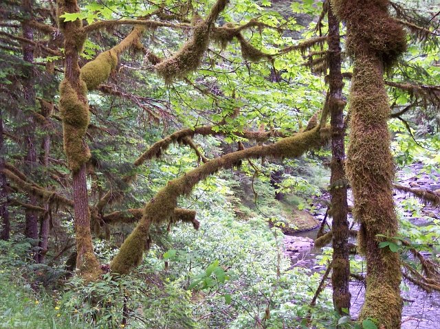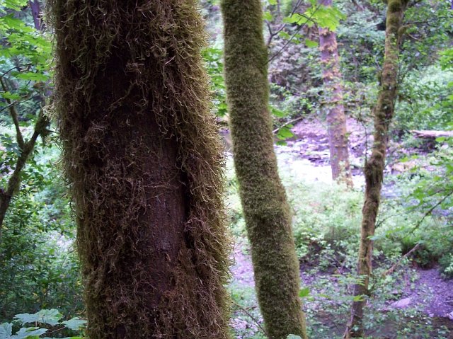 In areas where the sun does not hit the tree trunks directly, they are covered with this moss. Depending upon the amount of rain at the time, the covering may appear either green, brown, or a mixture of both. |