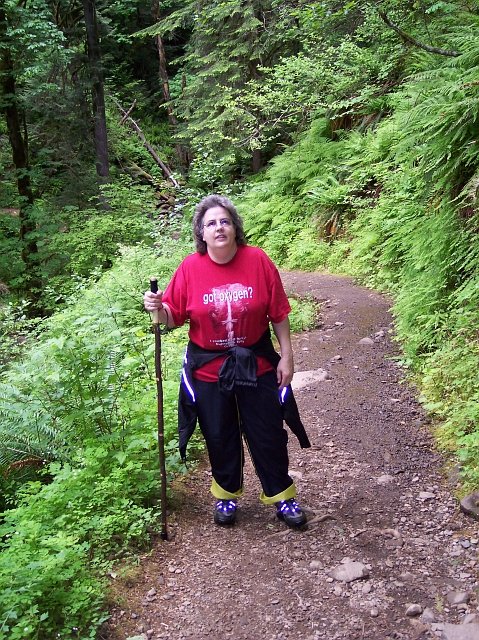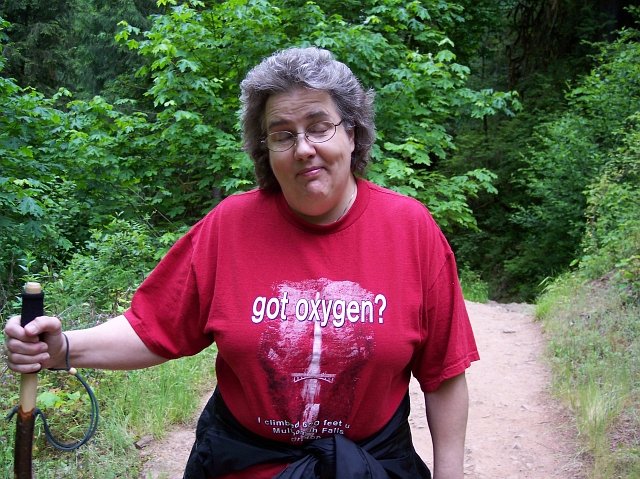 Dotti has now taken off her raincoat and you can see her tee-shirt, that she purchased during the DWLZ conference this year. It says, “Got Oxygen? I climbed 620 feet to the top of Multnomah Falls.” We are approaching the thirty-second anniversary of when Dotti and I first climbed Multnomah Falls together, and we can’t seem to get enough of those falls. |