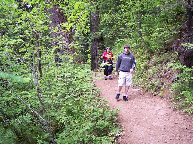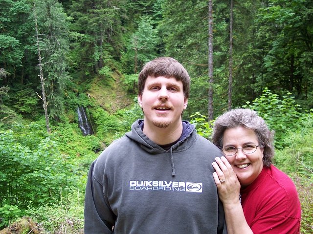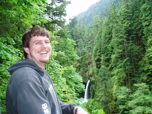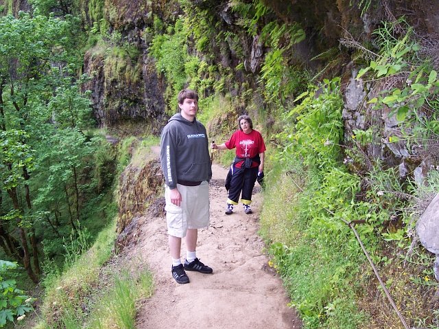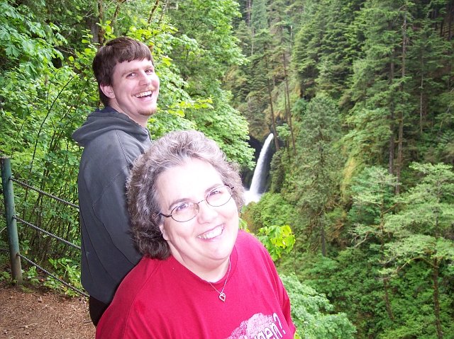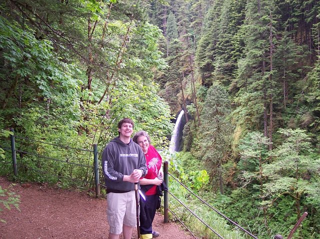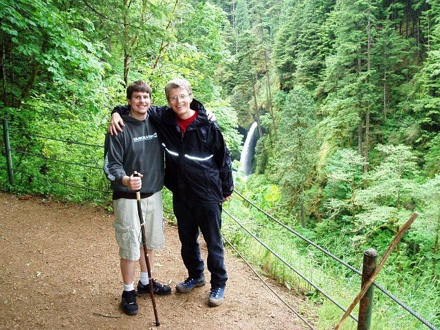 My son and I in front of Metlako Falls, which was pouring into the Eagle Creek. The very tall trees rooted into the precarious cliff edge stirs some of the same feelings that one has watching a tightrope walker. |