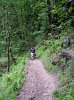 Dotti is hidden behind the turn, and LeRoy is coming up the trail. The heavy forest has broken off to the left and the cloud filtered sunlight is brightening up the view. |