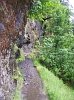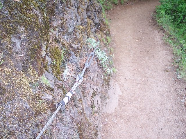 Here we go again with cable number two, for another narrow rock ledge path. This photo lends the strange feeling of walking through half of a tunnel. The left side is curved upwards and over the trail, as if it were going to join up with a similar wall on the right, but instead, there is sharp drop off. |