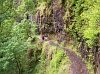 The chipped rock surface is wet here from a flow of water from above. On the left you can see the steel cable that has been put in place as a safety measure for those who might have a problem with heights and with the sharp drop to the right. |