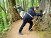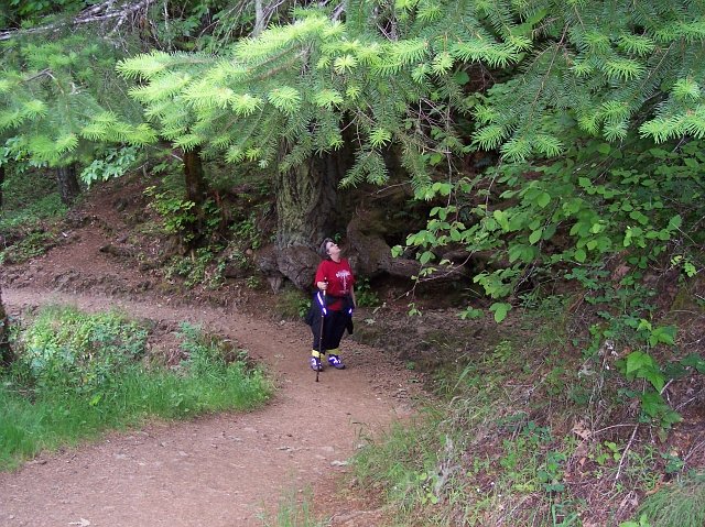 Dotti is neatly hidden behind the tree as she snaps a picture while LeRoy contemplates the beautiful scenery before him. The cable runs beside the trail just in case. |