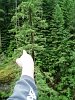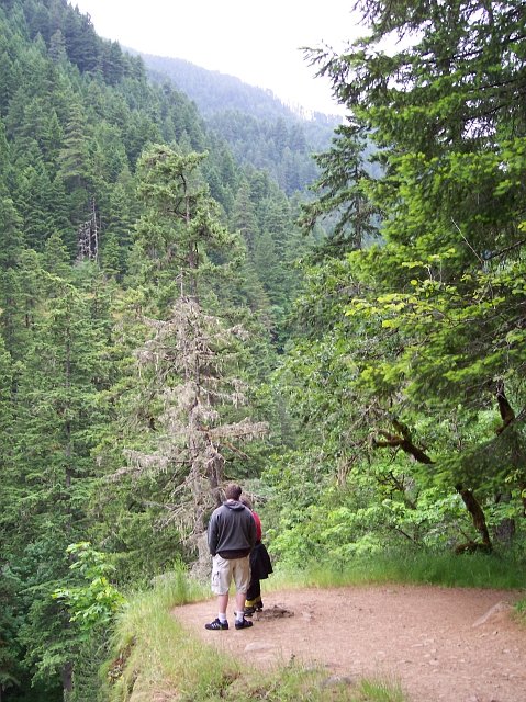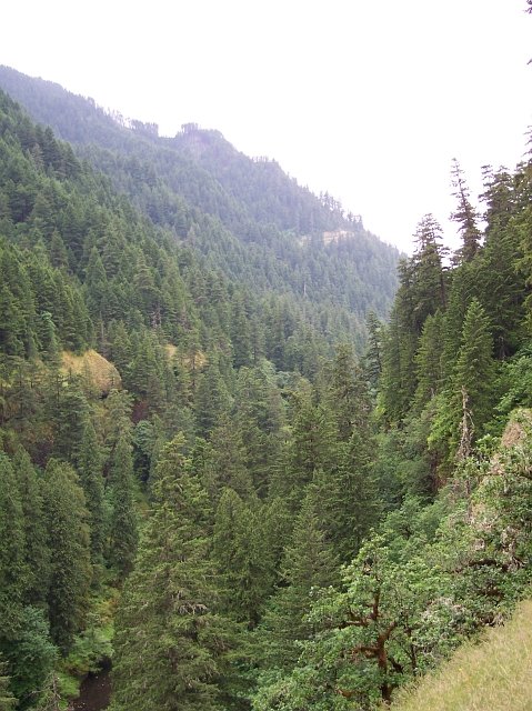 Looking north down the Eagle Creek canyon. Our van was waiting patiently for us in that general direction over a mile away and a few hundred feet below our current position. It feels a bit strange looking down on the tops of tall trees this way. |