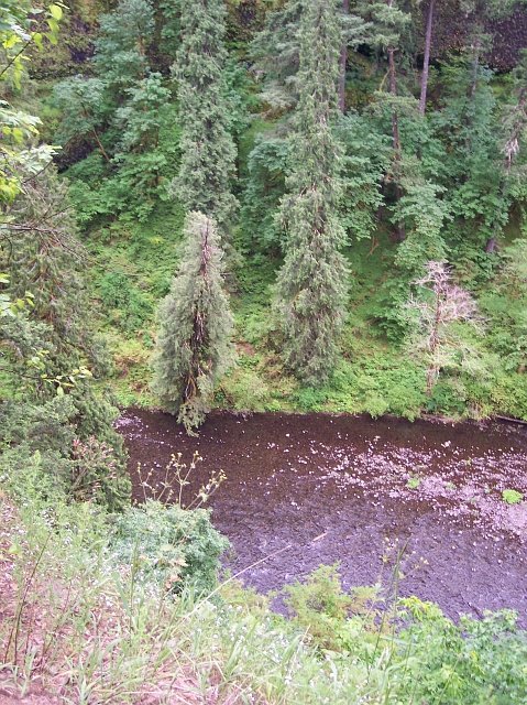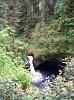 We can see how this falls got its name: the falls come over the rock looking very much like punch being poured out from a pitcher into a punchbowl. LeRoy said that his cousins had said that they have stood on that little patch of ground just above and to the left of the top of the falls, and jumped into the water below. The waterfall is about 15 feet tall, and that “platform” is another few feet up, making the jump somewhere around 20 feet. I don't think I would try it. |
