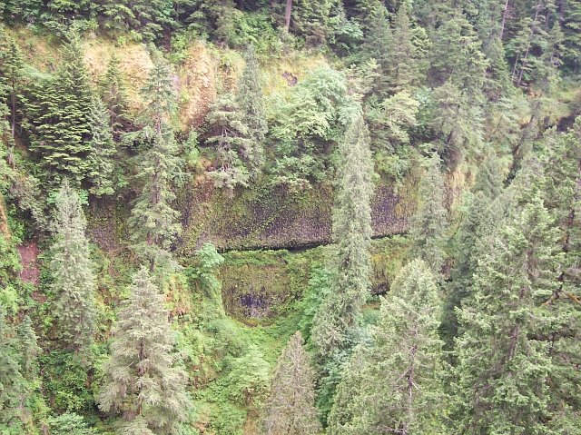 Looking up at a towering basalt wall. My imagination is taxed by the task of picturing what it must have been like when that wall of lava was moving into place so long ago. Now the trees, moss and other vegetation cling to it, and call it home. |