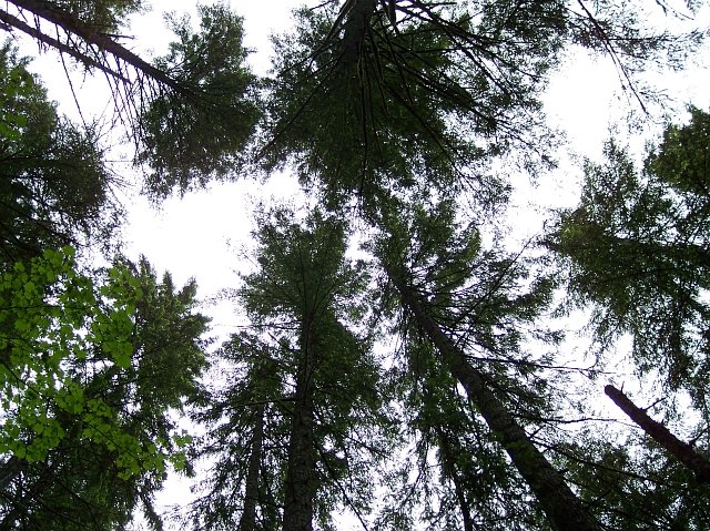 I took this picture looking up from the middle of the path. It is an interesting study in perception, as all parallel lines appear to be converging to a point in the distance. Looking up makes us feel small, as the trees are so much taller than we are, and yet we were looking down on trees as tall as these not long before from the cliffs. Would the trees have felt small if they had been able to see us way up there? The gray sky was bright enough to provide the light we needed without being overly bright and taxing our eyes. Very nice! |