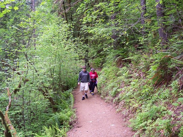 We actually ended up doing this particular hike because LeRoy suggested it. He likes this hiking trail best of all the ones he’s been on, and Dotti said that she agrees with him on that. I also love this Eagle Creek Trail, and I think the Tunnel Falls hike rivals even the Silver Falls trail for waterfalls, and it one of my favorites. It was nice having our son with us, not only for the enjoyable company, but also adding support for the name of our hiking club. J We have done all of the Punchbowl Falls hikes in either May or June, but we did the Tunnel Falls hike on my 52nd birthday on August 23, 2003. (Cool birthday present!) The trail looks very different from hike to hike. Sometimes it is rainy and others it is dry as a bone. When the sky is dark and gray, the trail looks completely different than it does when the sky is blue. The time of year not only impacts the amount of rain and the temperature, but it changes what the plant life looks like as well. So, although we have been here before, we still had surprises awaiting us. |