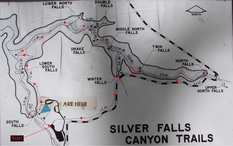 Dotti is checking our current location on the map. We are getting ready to once again walk down the Canyon Trail which we were forced to abandon back at the bridge beneath South Falls. |