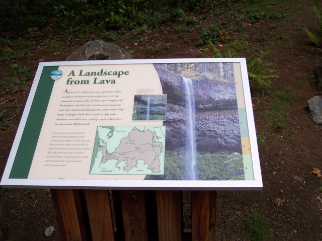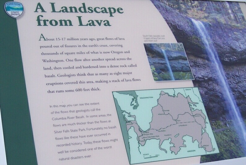 I snapped this picture of a sign along the way, because it has some interesting geological information about our area. (If you would like to read the text on this sign click here.) It goes far beyond Silver Falls, although the photo on the sign shows the South Falls, with less water flowing over it than the amount we saw flowing on this hike, dropping over thick layers of frozen lava. The map shows the extent of one the largest eruptions of lava in history. The map shows nearly all of the State of Washington and the northern part of Oregon, as well as a slice of the western part of Idaho. Most of this huge area of land is covered by the darker colored patch that indicates the area that was covered with deep lava flows, which started in Idaho and flowed all the way into the Pacific Ocean. It is nearly impossible to conceive of the extent of this massive event. The lava behind South Falls, shown on the photo on the sign, came from that massive flow long ago. The photo also shows some of the other factors working to shape the land. The water flowing over the lip of the lava wall is visibly wearing the lava down at the drop off point. It is also wearing it down behind the falls, as the mist from the falls works its way into the cracks in the basalt and during the winter it freezes, and splits the rock, causing pieces to break away. This process has created the huge cavern-like expanse behind the falls. Plant life sinks its roots into the cracks in the stone, forcing them to expand and thereby weakening the rock. The humans have cut a path that crosses the photo as well. The land is changing slowly, but it is being changed. What will happen in the future? We'll just have to wait and see. |