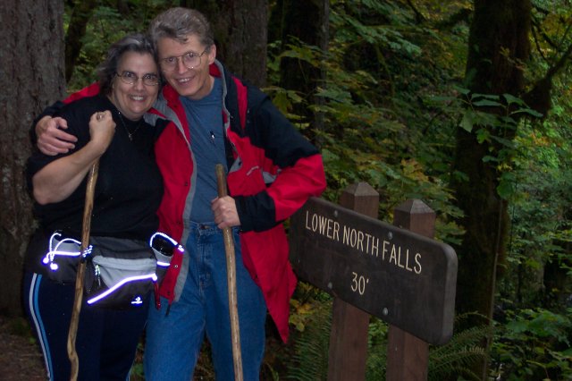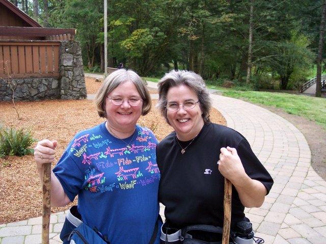 Joan snapped this picture of Dotti and I with our walking sticks, and the South Falls Lodge is in the background. |