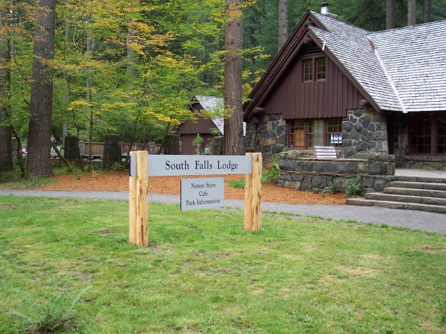 The South Falls Lodge. They have found an interesting name for their gift shop: Nature Store. However the eating establishment and purveyors of trail data have taken a more traditional approach to nomenclature. The buildings, trails, and signs all seem to fit pretty well with the beautiful surrounds that they are cast in. If you saw this sign, even without the pine trees in the background, you would feel that it belonged in a place very much like this. The same is true of the lodge, etc. |