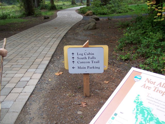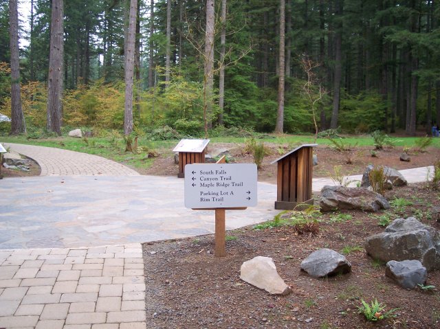 You can probably tell that this is all new construction. They have really worked hard on dressing up the hiking areas of the Silver Falls State Park. The sign points out that the South Falls are to be found to the left, along with two trails that we would be walking on. To the right is an alternate parking area and the trail upon which we would be returning on. But that would be nearly 5 hours after the time this picture was taken. |