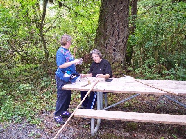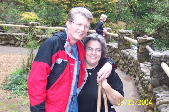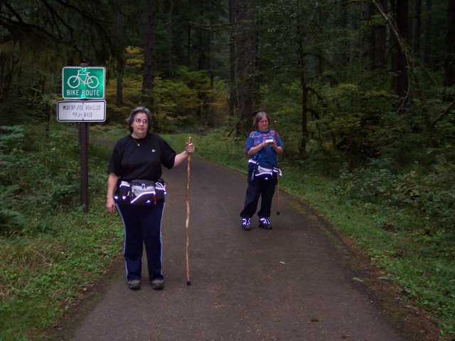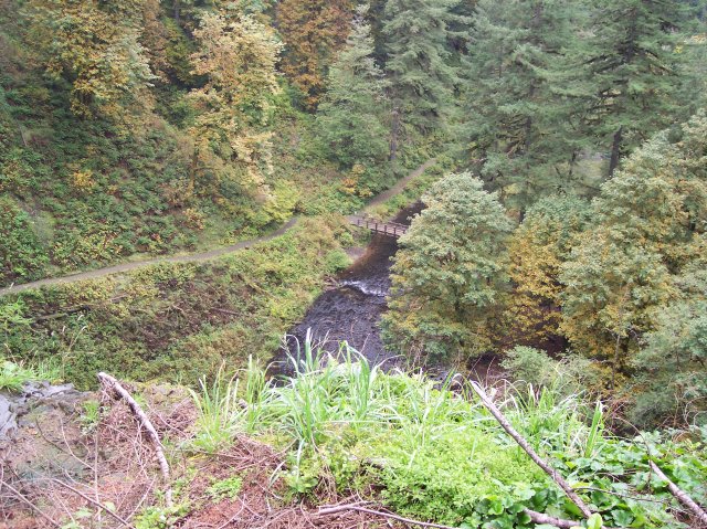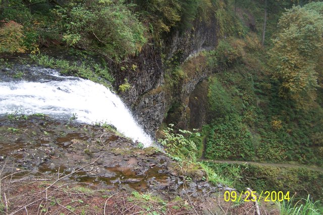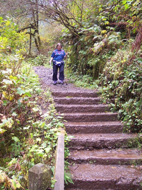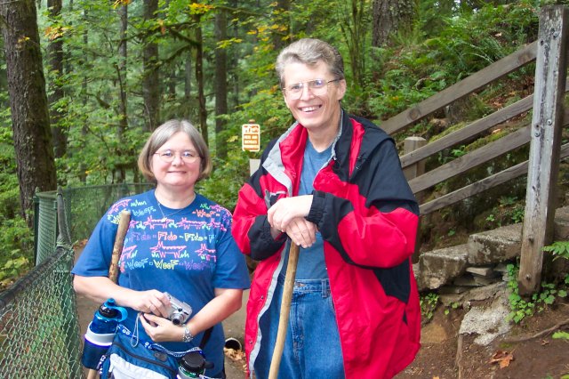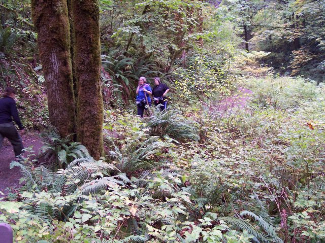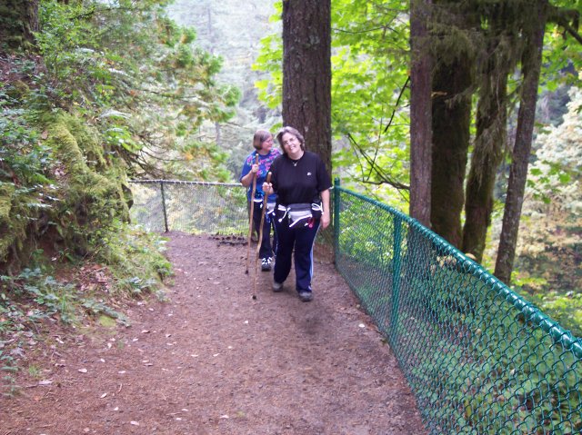 Joan and Dotti are getting their walking sticks crossed up, but they aren't crossing swords. J This is the path that leads to the top of the South Falls. |