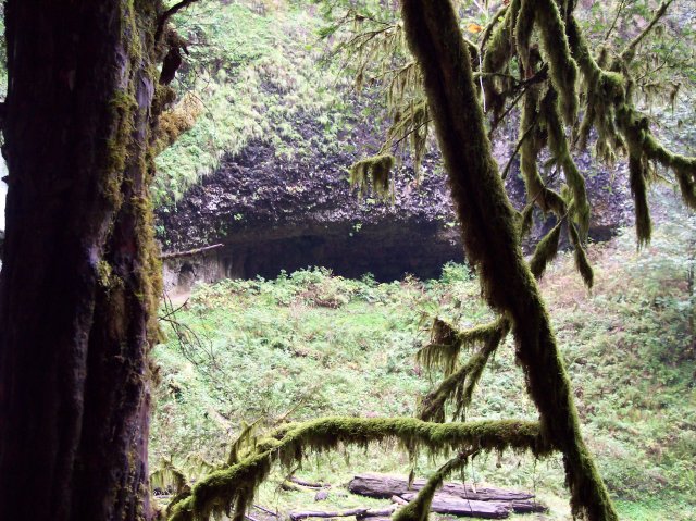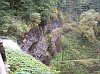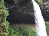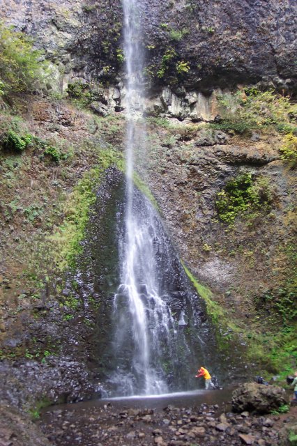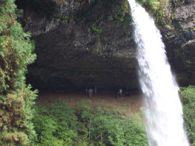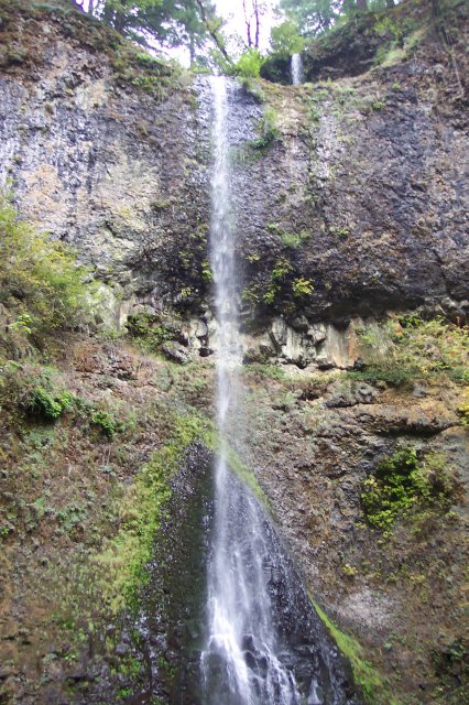 Coming back out into the gray sunlight, we can see the south side of the North Falls. From this angle the rock ceiling to the cavern looks thin, and the water is persistently wearing down into it. Over time this structural system will certainly change significantly. However, during our short lifetimes, it may appear relatively unchanged throughout. |