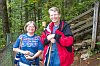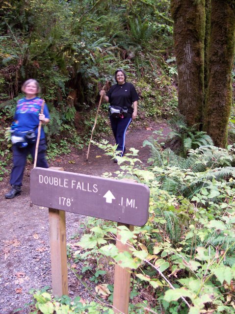 Joan and Dotti on the path to Double Falls. You can see that Double falls is actually 1 foot taller than South Falls, but it has such a small flow of water, it will never compare in popularity. |