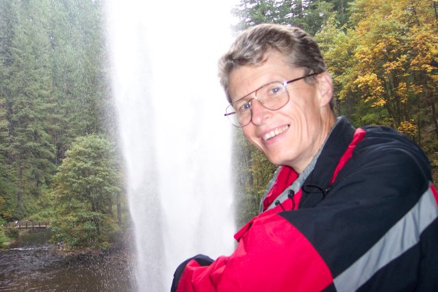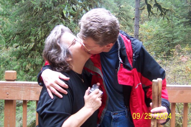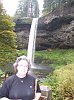 Joan and I have descended the stairs. We took a quick trip along the path that you can just see over Joan's right shoulder to see Frenchie Falls (more on that later.), and now we are ready to head down to the base of the South Falls. |