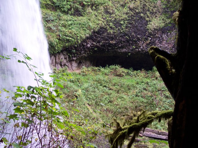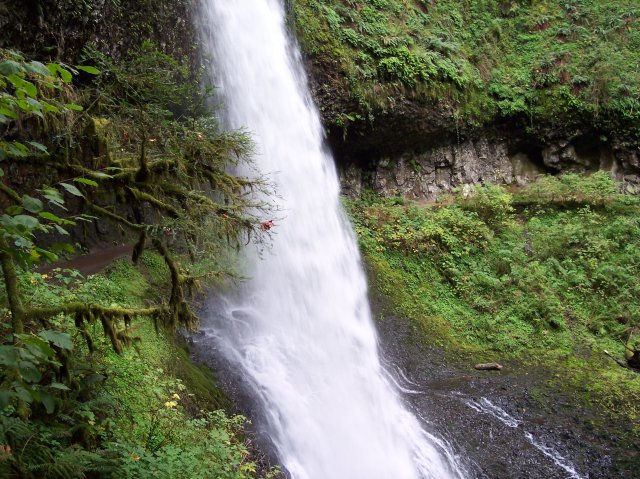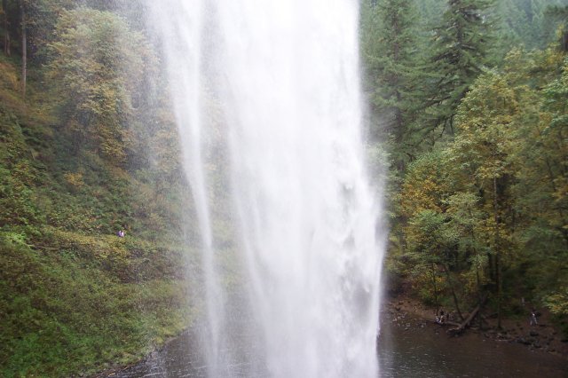 Looking downward, we capture a view of the water falling into the pool from behind the South Falls. |