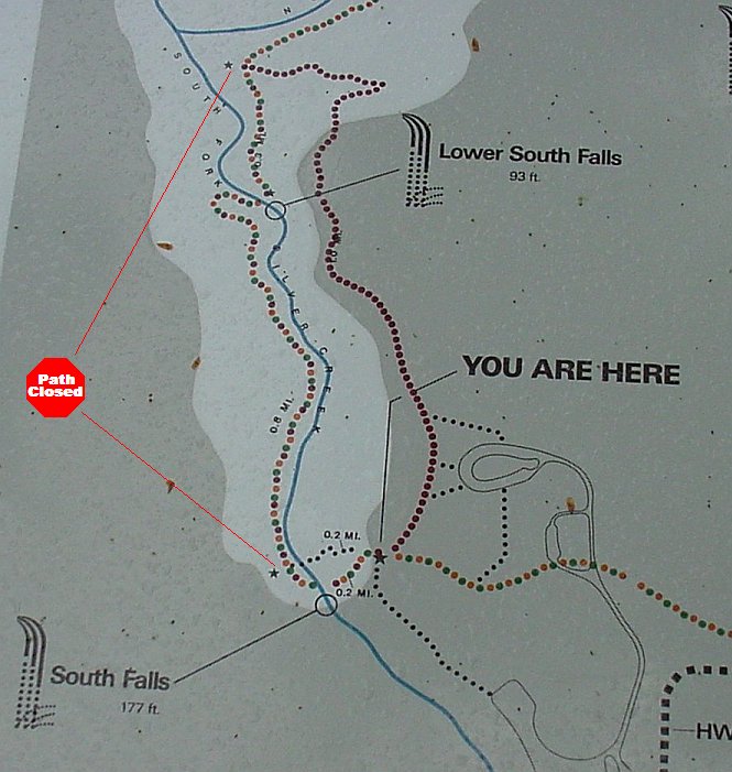 This is the other gate closing off the Canyon Trail. If we had passed through this gate and took that trail, it would take us back to the bridge under the South Falls. |