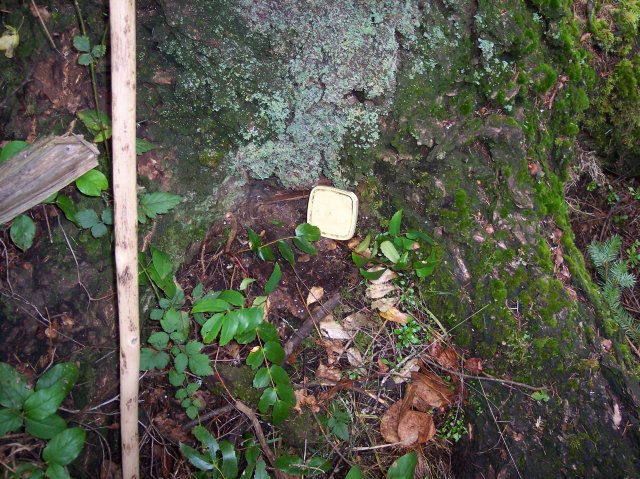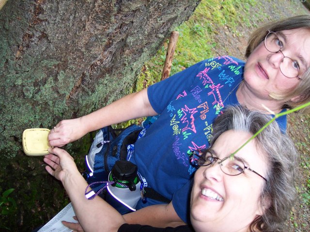 The camera was at a bit of an odd angle on this one, but it captured Joan and Dotti removing the cached letterbox. It was pretty cool finding our first one. |