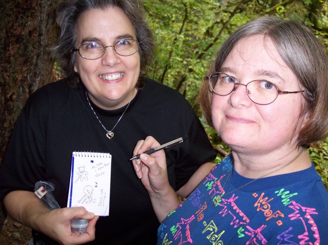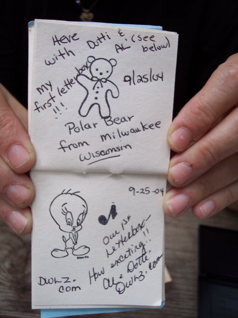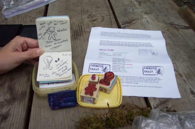 On the left is the logbook where we put our stamps and put our comments. Joan had a teddy bear stamp that she used. Dotti naturally had a Tweety stamp, and I used an eighth note stamp. On the paper to the right you can see where we stamped it a few times with the Frenchie Falls stamp. |
