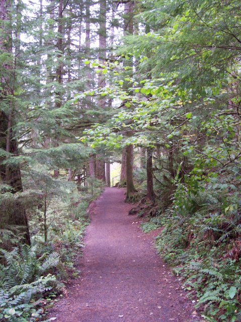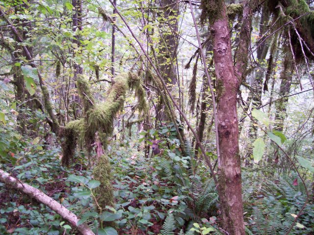 Our letterboxing behind us we returned to the trail. There is quite a wide array of plants growing here. The climate is wet and the ground is fertile. One other thingif you look very closely in the center of the photo you will see the head of a deer looking back at you. |