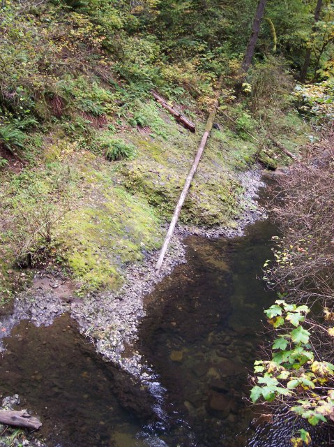 We have changed creeks now, as Joan and I are walking along the North Fork Silver Creek. While it is quite green here, you can see that the trees are not the thick pine forests of the Columbia River Gorge. We are on the border of the Willamette Valley, and as far south as is Salem, Oregon. |