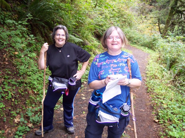 Here are my two lovely hiking companions. We have reached the place where the Maple Ridge Trail merges with the Canyon Trail. We just came down the path that lies behind Dotti and Joan, and have traveled 1.2 miles from the top of the South Falls. |