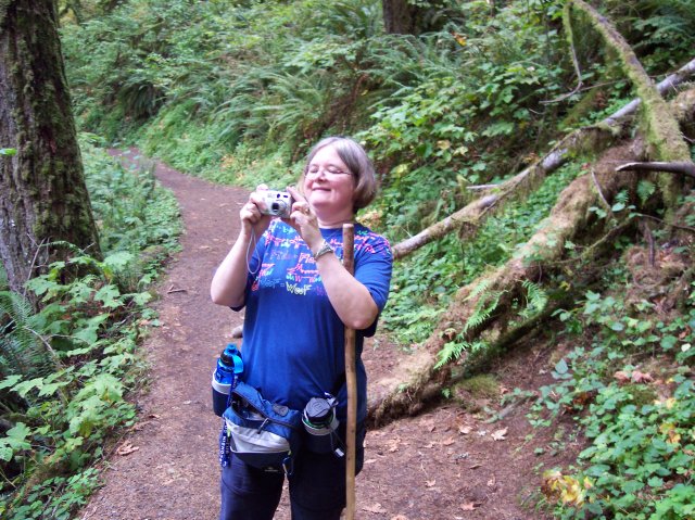 Here Joan is getting all set to snap a picture. The trail is heading for a stand of tall trees. |