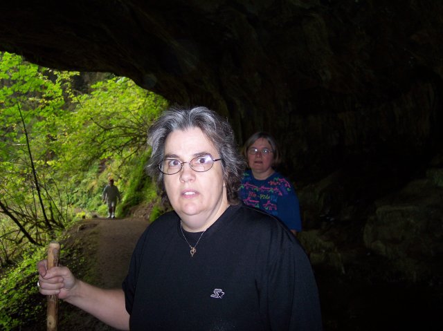 I caught Dotti when she wasn't expecting it with this shot. Notice how dark it was where we were at. Joan looks deep in shadow, and the back wall is invisible, totally lost in the darkness. The hiker in the background is moving from the bright green world into shadow. I used the flash, or Dotti and Joan would have been little more than silhouettes. |
