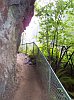 We are just north of the falls at this point working our way behind, and into the cavernous space created by the water working on the stone. Above the falls you can see the chain link fence that runs along the trail that we will be taking later, after ascending the 77 steps set into the stone. There is a parking lot not too far up that trail, so many people will park there and come down to look at the falls, or even start their hike of the entire loop from this end. |