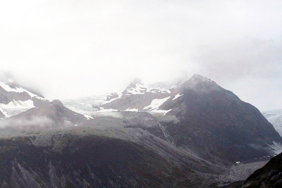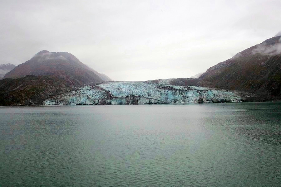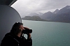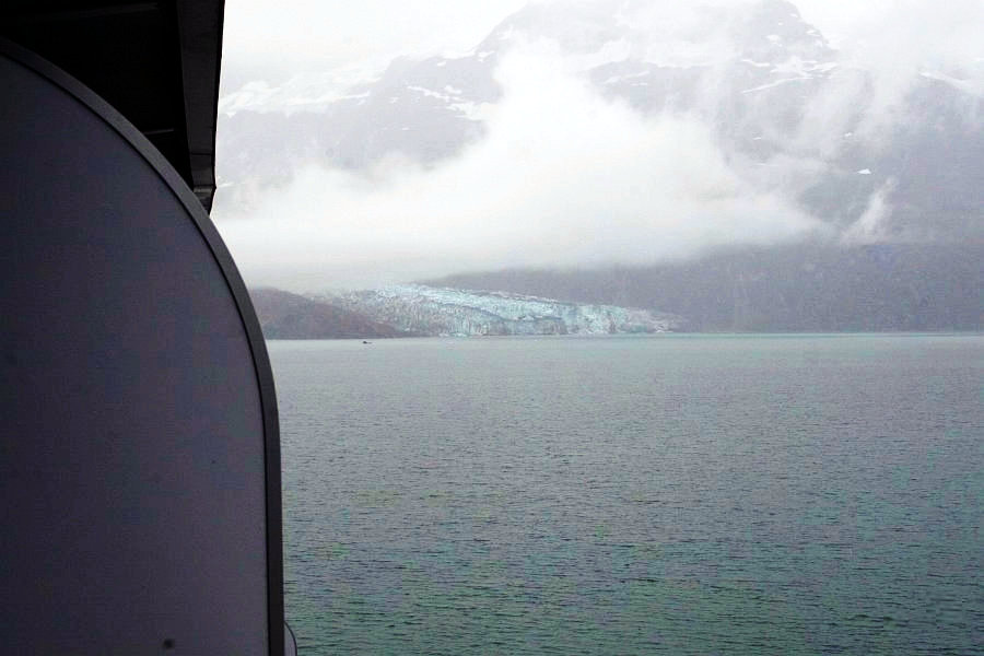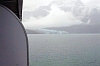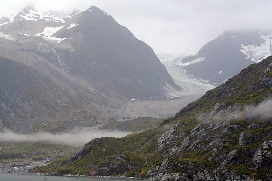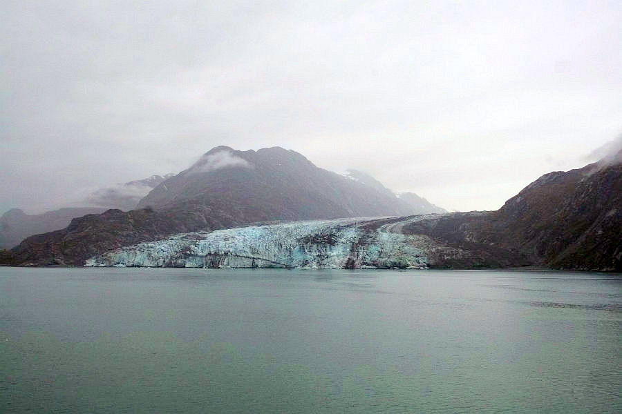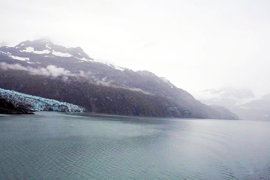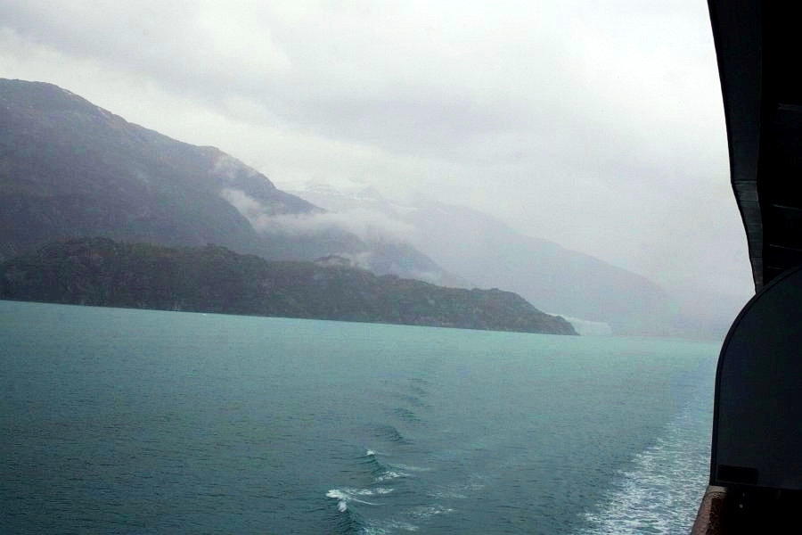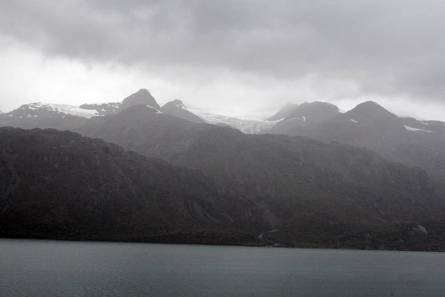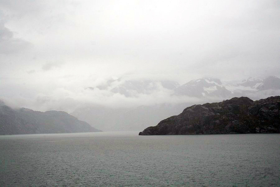 Standing high above the glacier is the 6,780-foot Mt. Cooper. What makes that interesting is that the foot of the mountain is standing in the ocean. We are less than 5 miles from the top of the mountain, and it is over a mile high. If you measured the angle from base to top it would be 16°, whereas the 14,115-foot Pike's Peak would only cover 15° when viewed from 10 miles away in Colorado Springs. The clouds are hanging low over Glacier Bay and they do drop some occasional rain. Still, our verandah is covered and I wasn't going to miss this! The mouth of John Hopkins Inlet, and here we go into it. Clouds and glaciers both hang on the mountains in the background, and the gray and white colors merge into an eerie backdrop for our adventure. What secrets were in store for us to uncover? I couldn't see any ice in the water. Would we see any more?