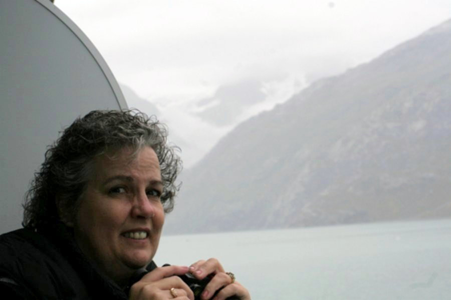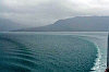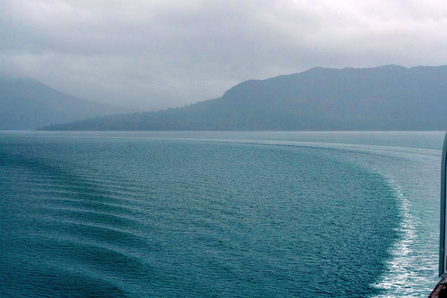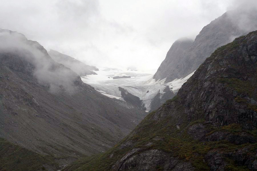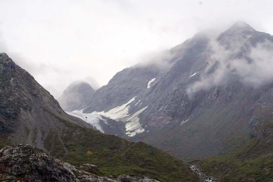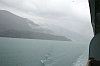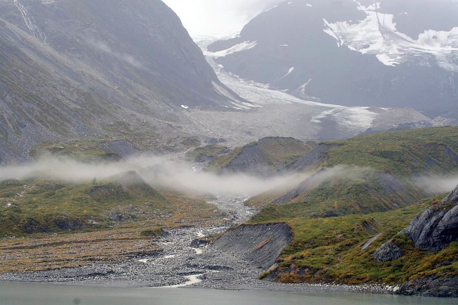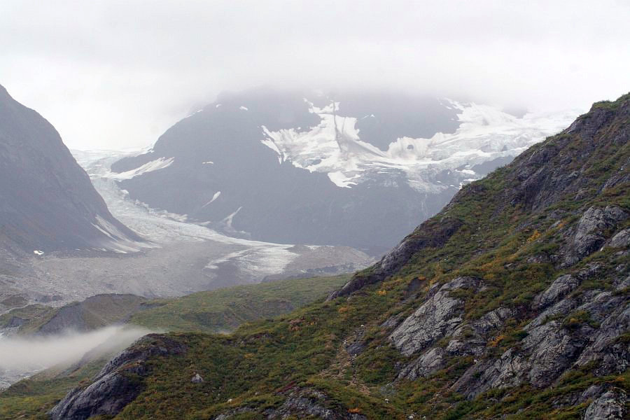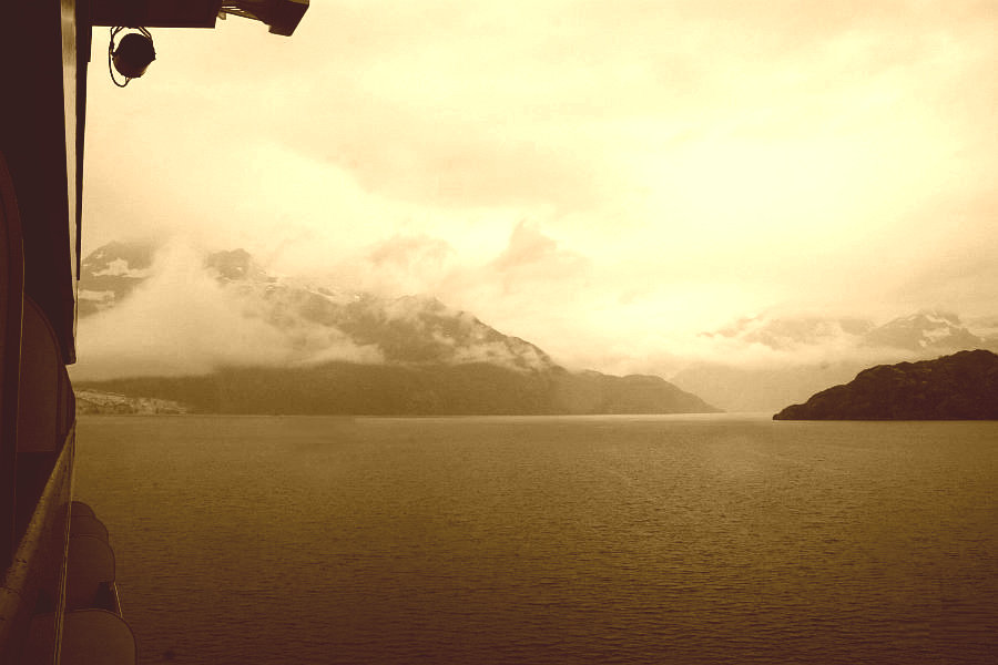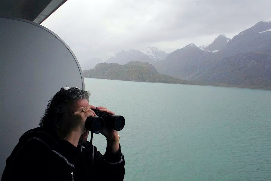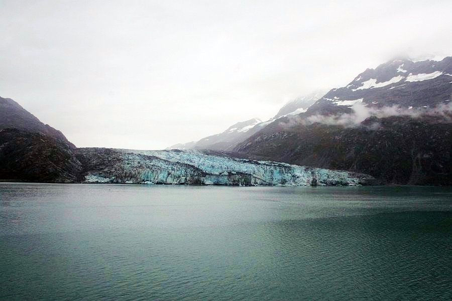 Standing high above the glacier is the 6,780-foot Mt. Cooper. What makes that interesting is that the foot of the mountain is standing in the ocean. We are less than 5 miles from the top of the mountain, and it is over a mile high. If you measured the angle from base to top it would be 16°, whereas the 14,115-foot Pike's Peak would only cover 15° when viewed from 10 miles away in Colorado Springs. The clouds are hanging low over Glacier Bay and they do drop some occasional rain. Still, our verandah is covered and I wasn't going to miss this! The mouth of John Hopkins Inlet, and here we go into it. Clouds and glaciers both hang on the mountains in the background, and the gray and white colors merge into an eerie backdrop for our adventure. What secrets were in store for us to uncover? I couldn't see any ice in the water. Would we see any more?