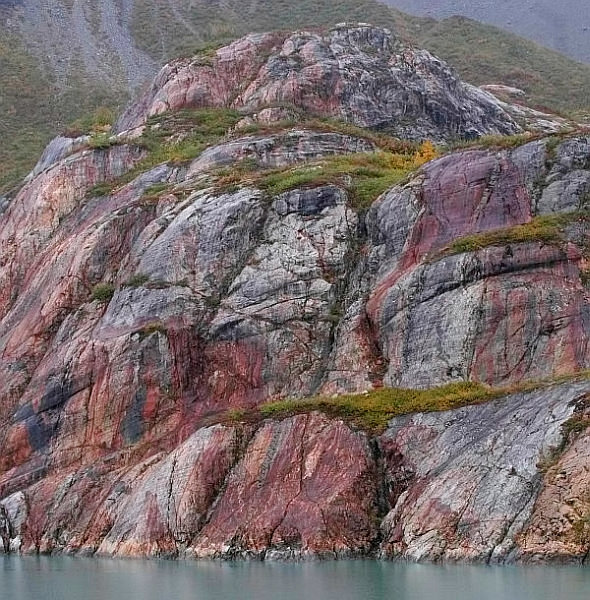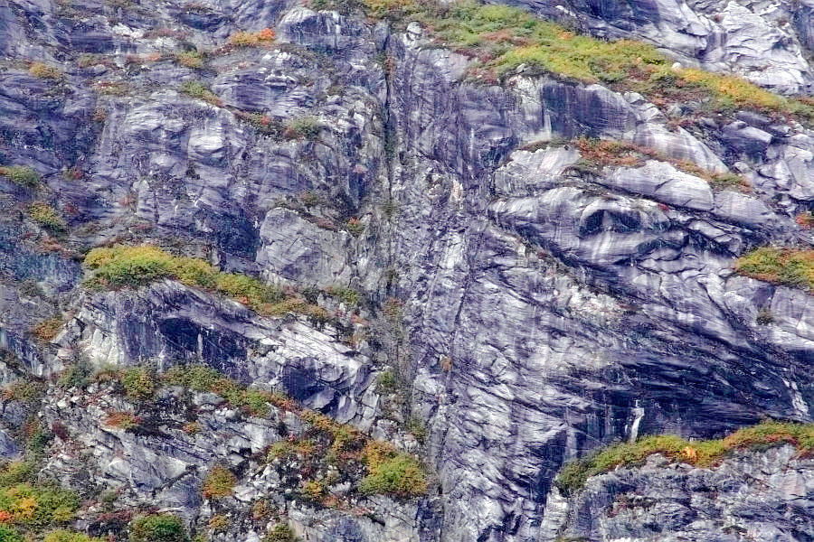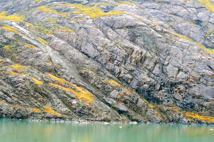 It seemed odd looking right up the glacial valley this way. The Lamplugh Glacier is dirtier than the Reid Glacier was. There is no part of this one that would seem to be "good enough to eat," and the right side is especially dirty. The reason for this is that the left side has an almost straight edge all the way up the valley to the Brady Icefield. It doesn't have to expand and contract as much to match the surface it is sliding against. The right side has a quite different arrangement. There are some large changes in the contours of it sliding surface. This forces it to change shape by pushing and dragging against the rock far more severely. The rock reacts by breaking up and dropping down in rockslides on to of the ice. How high was the ice in this valley we are looking at when the entire 65 miles of the bay were filled with ice? What did it look like then? Did it flow, or did it just rest waiting, for the thaw? Just imagine what it would take to gouge and mark these rock surfaces this way! Ice sliding along, with boulders imbedded inside, held in place and used much like a key in the hand of a vandal down the side of a car, marring and scaring the surface as it goes along. But in this case there are many "hands" holding many "keys" because the marks are high and low and in between.