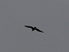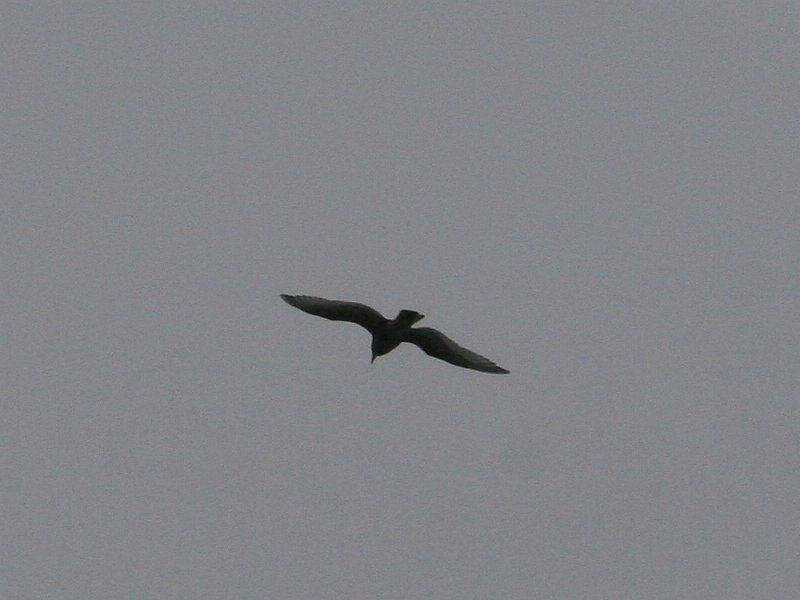 A gull flies by in search of a meal, and it looks almost black against the gray sky.