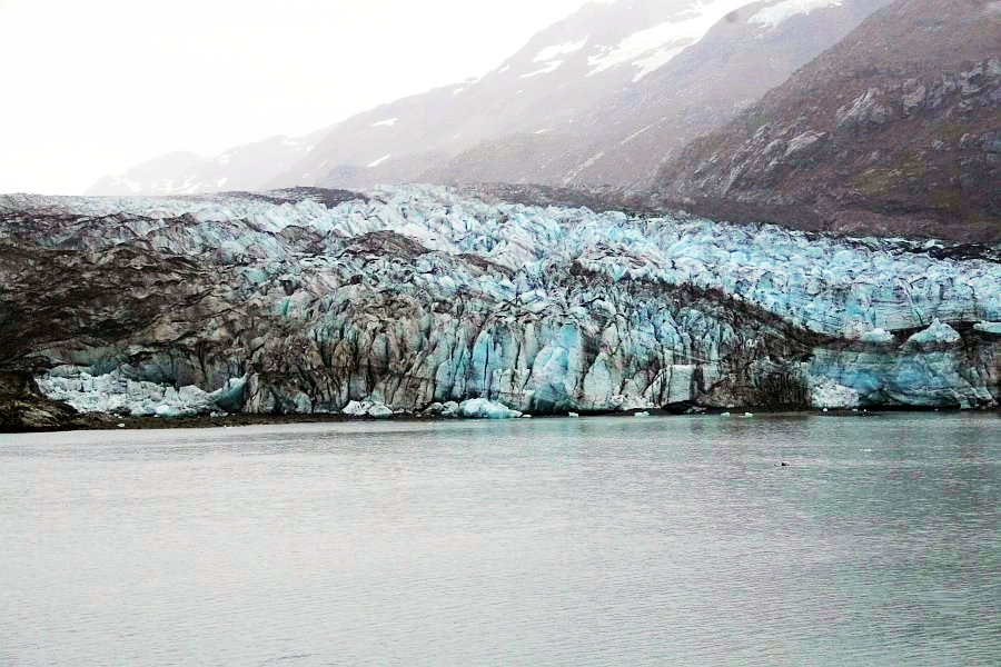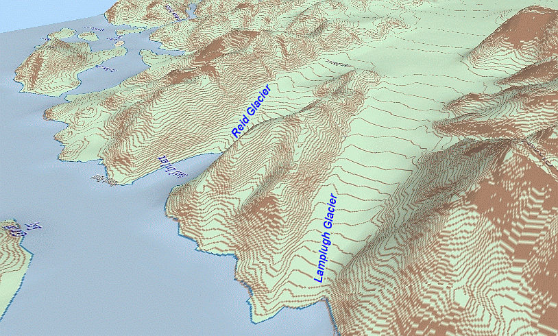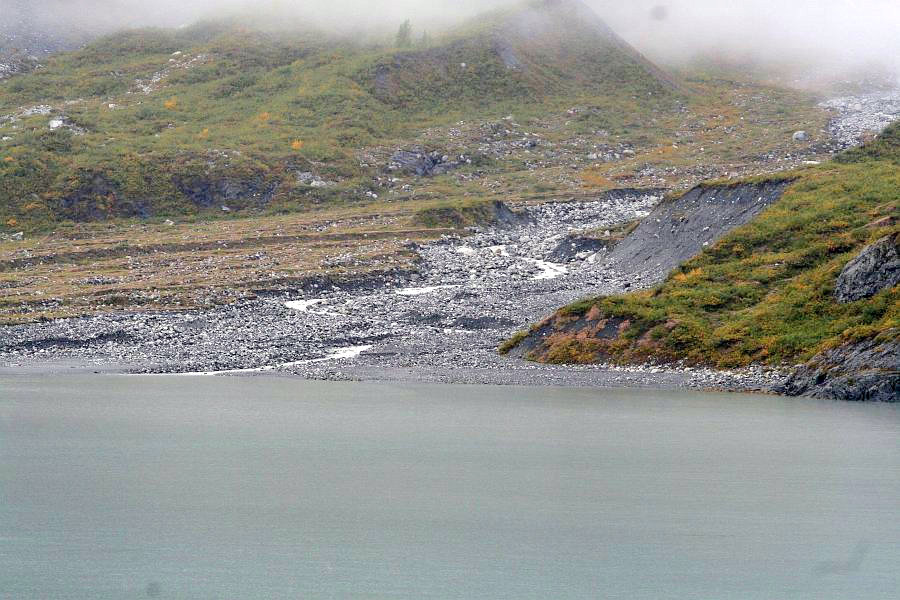 Turning once again to give us more of a view of the Lamplugh Glacier, which is still dropping ice into the water, though it is retreating, as is the Reid Glacier we saw on the last page. Lamplugh averages around 155 feet above the water line, and varies from 10 to 40 feet under the water.