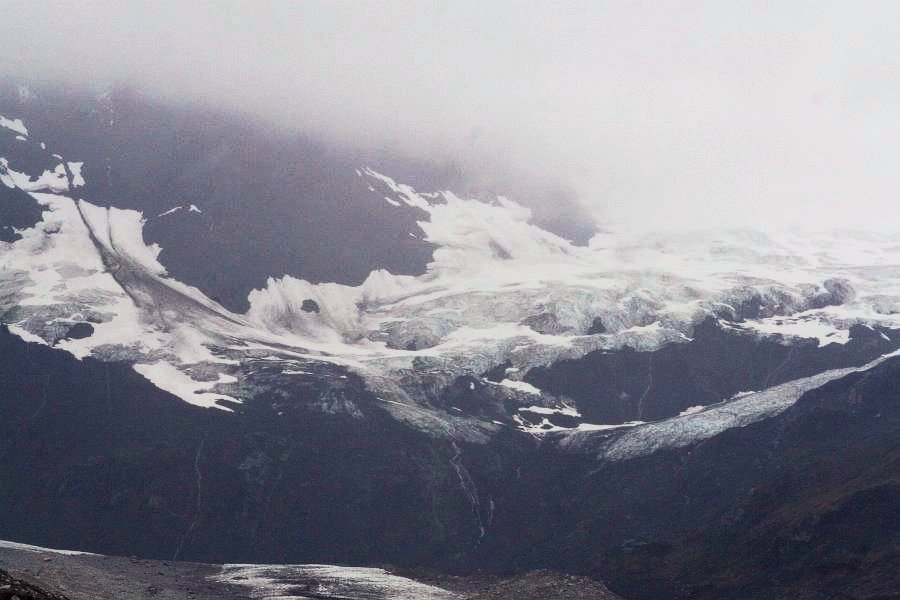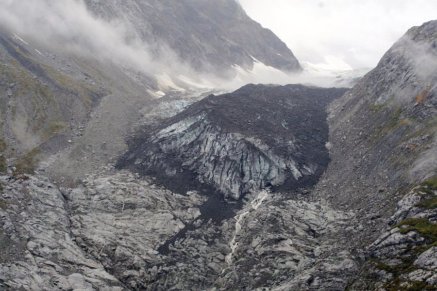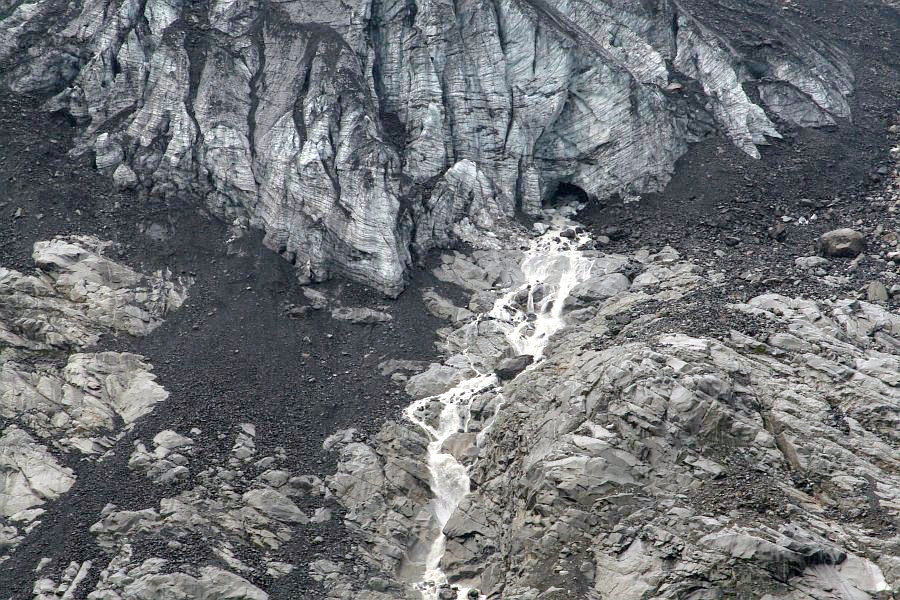 High above us rests an "alpine glacier", similar to the ones you would find on very tall mountains around the world. This type of glacier does not move down to the sea, and it cannot create icebergs. But it does shape the rocks beneath it.