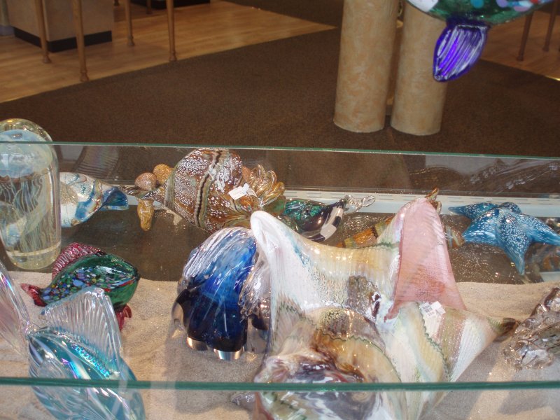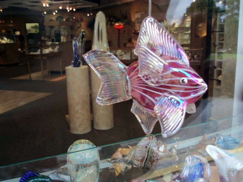 We must have been hungry because, with three cameras on us, we didn’t take any more pictures until we were finished and back to shopping! We have found our way back to Lincoln Street once more, near the intersection with Harbor Drive. We’re looking in the window of a shop selling glass works. One of the pieces seems to be looking back at us.