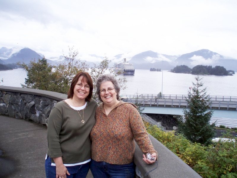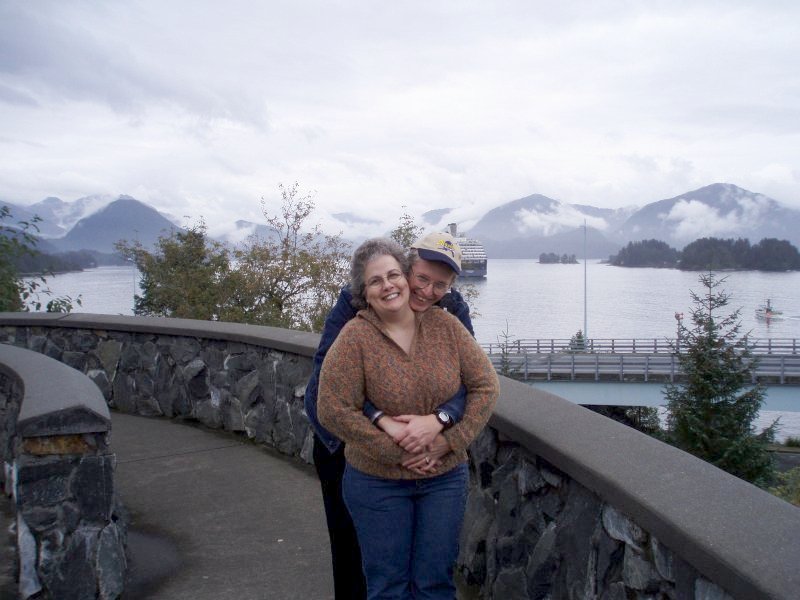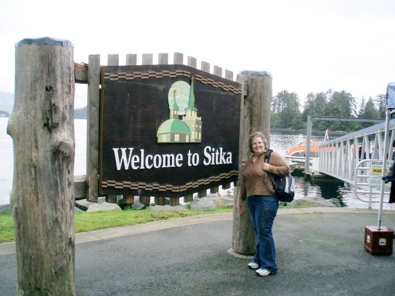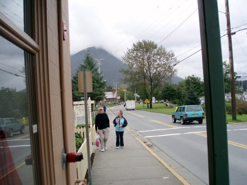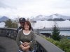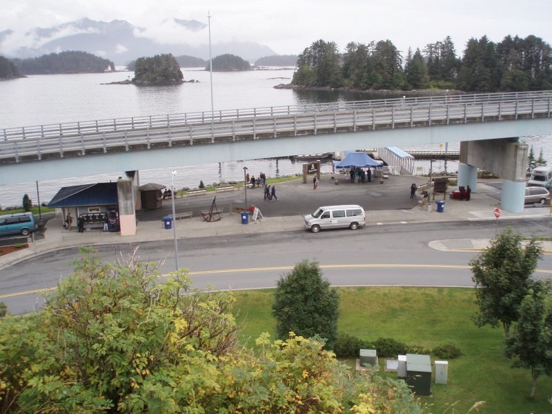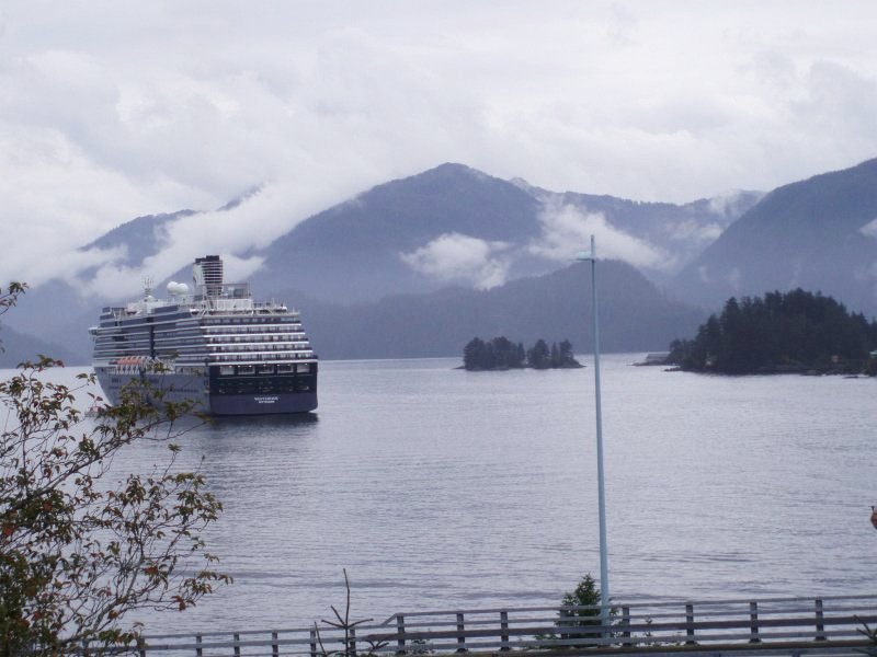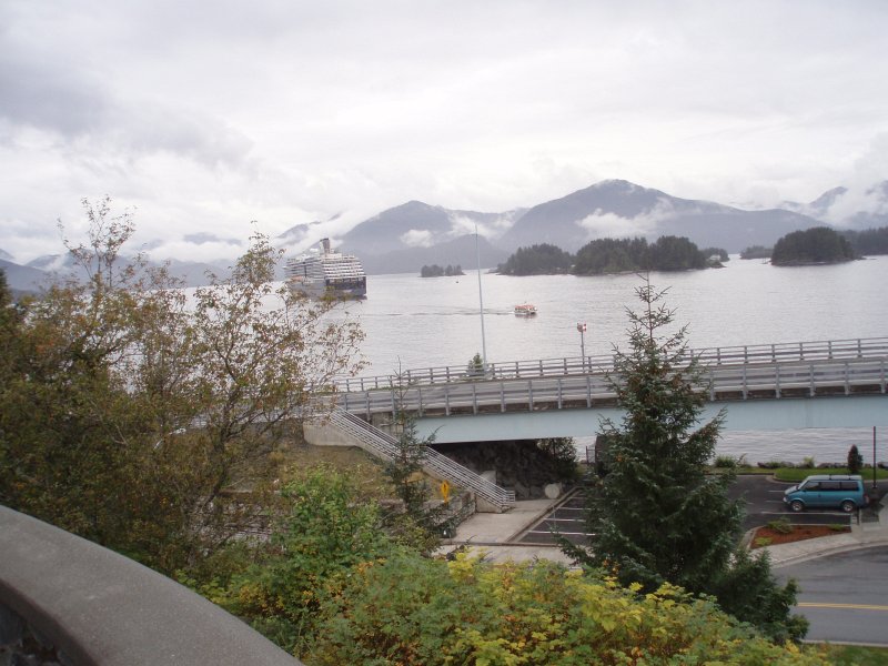 As you move to the right you can see beneath the bridge our loading dock where we soon would rendezvous with the launch that would take us back to our ship. In the fourth picture the runway for the Sitka Airport is visible running out into the water, while above some gulls are gliding by as if to say, "Yes, you can fly, but we have been doing it much longer!" It was almost exactly 7 hours after I saw the amphibious plane take off right from under that bridge. It seemed like a lot more time than that had passed. By the time I took this picture, I was getting pretty tired. We had been on our feet, walking almost constantly for four and a half hours. We had gone up stairs, and retraced our steps all along Lincoln Street. My mind had been actively taking in information nearly the entire time. I had used up most of my internal resources, or at least that is how it felt. I zoomed in a bit to catch a closer look at the place I was ready to return to. She was looking mighty good about now!