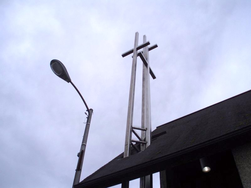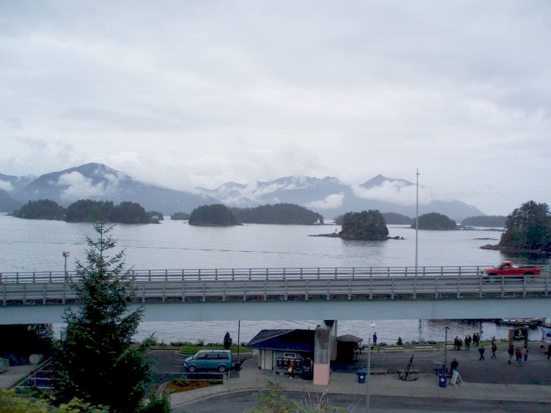 On the right side of the road, looking a bit like a Pizza Hut, with its hexagonal roof, is the Harrigan Centennial Hall. If we had walked straight from there to here, it would have been short walk indeed. But instead we walked the opposite direction, back up to Lincoln Street, and came along that road past St. Michael's Cathedral, whose tower is just visible as it is nearly tangled up with the branch on the left of the photo. The masts held in Crescent Harbor are just visible over the treetops, but the rock protective seawall is very easy to see, running across the water. Zooming in, St. Michael's Cathedral becomes very easy to see. Just to the right of it, but significantly shorter, the triple crosses of the Sitka Lutheran Church are visible.