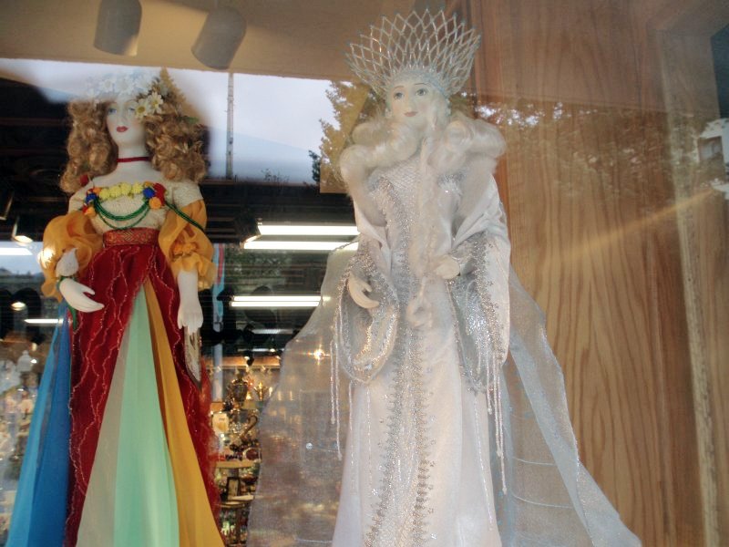 Two lovely dolls in a shop window. The one on the right could be an empress in that gorgeous gown. The one on the left wears a less lavish dress, but she too is very beautiful.